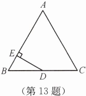 13.如图所示,在△ABC中,AB= AC= 13,BC= 10,D为BC的中点,DE⊥AB,垂足为E,求DE的长。