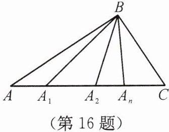 16. 如图所示,在$\triangle ABC$中,$A_1,A_2,A_3,…,A_n为AC边上不同的n$个点,首先连结$BA_1$,图中共有3个不同的三角形,再连结$BA_2$,图中共有6个不同的三角形……