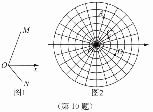 10. 在航空、航海等领域经常用距离和角度来确定点的位置。规定如下:在平面内取一个定点O,引一条射线Ox,对于平面内任何一点M,用ρ表示线段OM的长度,θ表示按逆时针方向从Ox转动到OM的度数,有序数对(ρ,θ)就叫做点M的极坐标,这样建立的坐标系叫做极坐标系。
