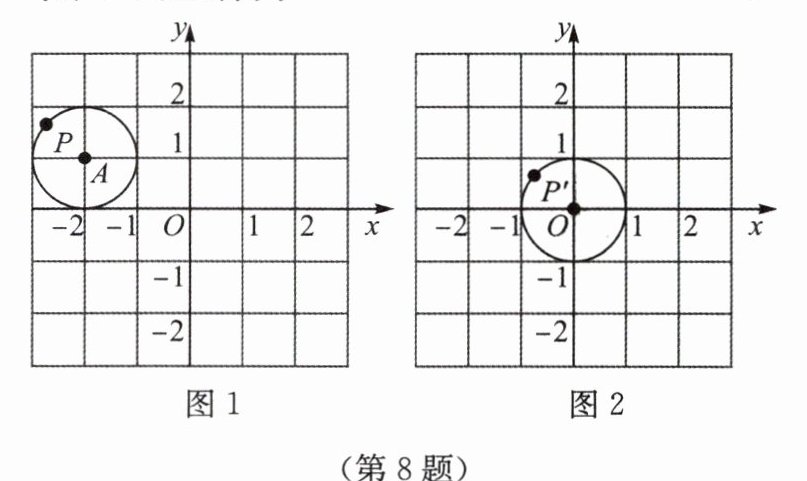 8. 如图所示,图1中的⊙A经过平移得到图2中的⊙O,如果图1中⊙A上一点P的坐标为(m,n),那么平移后在图2中的对应点P'的坐标为 ( )