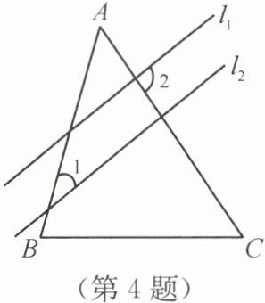 4.如图所示,直线$l_1//l_2,$且分别与△ABC的两边AB,AC相交,若∠A= 50°,∠1= 35°,则∠2的度数为( )