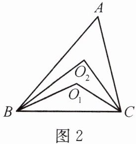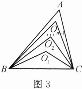 $\frac{1}{n}×180^{\circ}+\frac{n - 1}{n}\angle A$ 【解析】根据题中所给的信息,总结可得:∠BO₁C = $\frac{n - 1}{n}×180^{\circ}+\frac{1}{n}\angle A$,∠BOₙ₋₁C = $\frac{1}{n}×180^{\circ}+\frac{n - 1}{n}\angle A$。