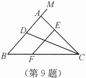 9. 如图所示,在△ABC中,E和F分别是AC,BC上一点,EF//AB,∠BCA的平分线交AB于点D,∠MAC是△ABC的外角,若∠MAC= α,∠EFC= β,∠ADC= γ,则α,β,γ三者间的数量关系是( )