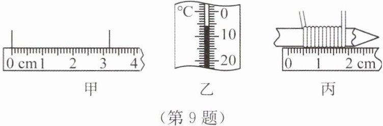9. 正确的操作和读数是准确测量的前提。如图甲所示,该木块的长度是______cm。如图乙所示,温度计的示数是______°C。如图丙所示,将铜丝在铅笔上紧密排绕,铜丝的直径是______m。