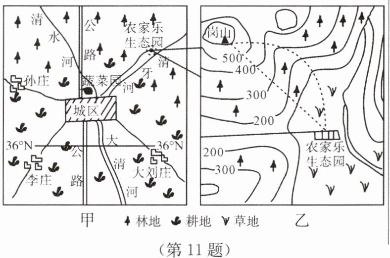 11. 如图甲所示为我国东部季风区某蔬菜园和农家乐生态园的位置示意图,如图乙所示为该地农家乐生态园附近的等高线地形图。读图并回答相关问题: