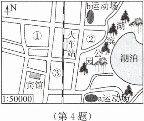 4. 深秋的周末,东北风带来了阵阵凉意,小玲、小丽、小佳三人相约去湖滨公园划船游玩。她们计划在湖泊西北方向的运动场会合,读图并回答下列问题: