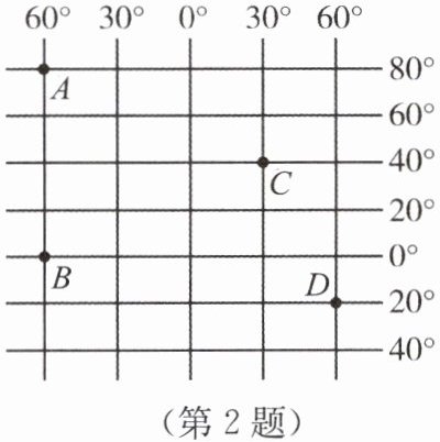 (2)A、B、C、D四点中,位于北半球的是______(填字母,下同),位于东半球的是______。