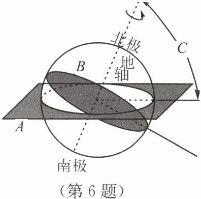 6. 如图所示为地轴与地球公转轨道面的交角图,请据图回答下列问题: