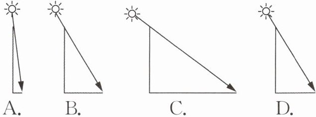 4. 针对春分、夏至、秋分和冬至四个节气的太阳高度,小金画了下面四幅图,分别表示四个节气正午时同一竖杆在水平地面上的影子及太阳光(从正东方向观察),其中能表示杭州夏至日的情形的是 ( )