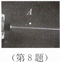 8. 小明在学习"光的传播"时,看到老师的一个演示实验,过程如下:①用激光笔射向水中,观察到光是一条直线(如图所示);②在A点处用漏斗向水中慢慢注入海波溶液,观察到光发生了弯曲;③经搅拌后,观察到光又变直了。小明根据上述现象得出的结论,正确的是( )