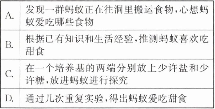 |D.|通过几次重复实验,得出蚂蚁爱吃甜食|