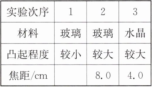 (2)观察表中数据,由第1、2次的实验可得出结论:由同种材料制成的凸透镜,凸起程度越大,焦距越______。