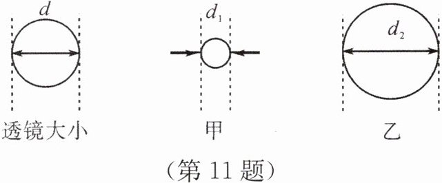 11. 小明为判别直径相同的两个透镜的类型,分别将它们正对太阳,把一张纸放在它们的下方,在纸上得到相应的光斑,透镜与光斑的大小如图所示($d_{1}\lt d\lt d_{2}$)。其中形成甲光斑的是______(填“凸”或“凹”)透镜,形成乙光斑的______(填“一定”“可能”或“一定不”)是凹透镜。