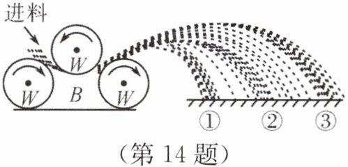14. 如图所示为农用扬场机的示意图。谷物脱粒后,谷粒、糠皮及少量碎石的混合物在快速转动的轮W和皮带B的带动下被抛出,谷粒、糠皮、碎石落地的远近不同,从而形成①、②、③三堆,达到分离的目的。这三种东西中,______的落地点距扬场机最近,______的落地点距扬场机最远。同样大小的谷粒和碎石,为什么落地点的远近不同?______。