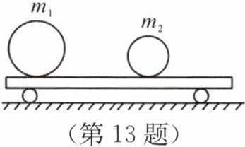 13. 如图所示,在一辆表面光滑且足够长的小车上,有质量为$m_1$、$m_2$($m_1>m_2$)的两个小球,两个小球随车一起以相同的速度向右做匀速直线运动,忽略空气阻力。当小车突然停止时,两个小球由于______要继续向右运动,因此两个小球______(填“会”或“不会”)相撞。