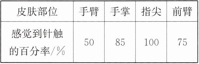 16. 为了测试皮肤的不同部位对触觉的敏感程度,小刚利用一支绘图笔在小明皮肤的某些部位画上测试区。给小明蒙上眼睛后,小刚用针轻触测试区上不同的点,当小明感觉到针触时,就说“是”。将小明能感觉到针触的百分率记录下来。在皮肤的不同部位重复此实验,其结果如下表所示: