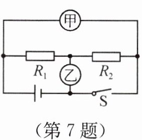 7. 如图所示的电路中,电源电压保持不变,当开关S闭合,甲、乙两表为电压表时,两表的示数之比U甲∶U乙= 4∶1;当开关S断开,甲、乙两表为电流表时,两表的示数之比I甲∶I乙为( )