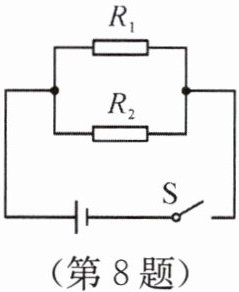 8. 【邵阳】已知$R_1∶R_2= 2∶3,$将它们接在如图所示的电源电压为12V的电路中,闭合开关S,则通过它们的电流之比及它们两端的电压之比分别是( )