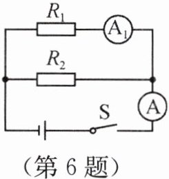 6. 如图所示的电路中,电阻$R_1$的阻值为30Ω,电阻$R_2$的阻值为60Ω,闭合开关S,电流表$A_1$的示数为0.2A。求: