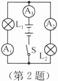2. 如图所示$,L_1$和$L_2$是两只完全相同的灯泡,当电流表$A_1$的示数为0.4A时,电流表$A_2、$$A_3$的示数分别是( )