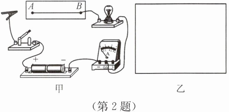 2. 【湖州】某科学兴趣小组的同学在探究影响导体电阻大小及灯泡亮暗的因素时,做了如图甲所示的实验:将鳄鱼夹从较长的镍铬合金丝的A端逐渐滑向B端时,发现电流表的示数逐渐增大,同时灯泡逐渐变亮。
