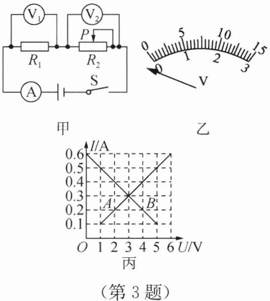 (2)纠正错误后,实验中小新记录了多组电流表A和电压表$V_{1}$、$V_{2}$的示数,作出A、B两条图线,如图丙所示,其中表示通过$R_{1}的电流和R_{1}$两端电压关系的图线是______。