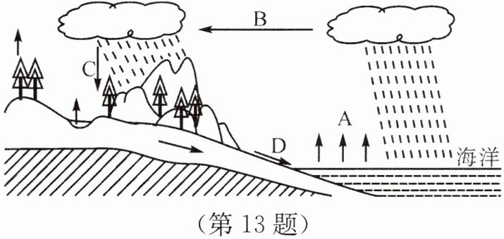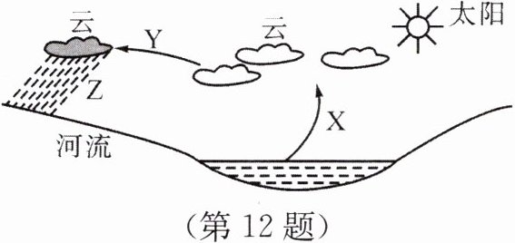 12.水资源是可再生资源,在水循环中,水不断地在大气和地表之间运动。如图所示为水循环的一部分,图中标着X、Y和Z的地方表示水循环中的三个环节。下列说法中,正确的是 ( )