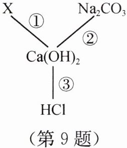 9. 小明在学习$Ca(OH)_2$的化学性质时,归纳出了$Ca(OH)_2$与其他物质间相互反应的关系(如图所示,图中“—”表示相连的两种物质能发生反应)。