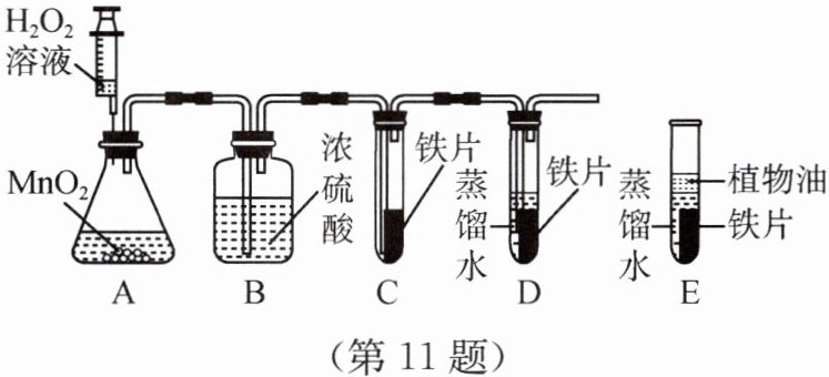11. 探究铁生锈条件的实验所需时间一般比较长,为此,某兴趣小组设计了改进实验,如图所示(其中夹持及固定装置已略去)。