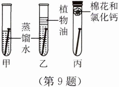 9. 如图所示为探究铁生锈条件的实验(其中氯化钙是一种干燥剂),下列有关该实验的说法,正确的是 ( )