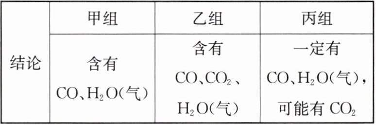 | 结论 | 含有CO、$H_2O($气) | 含有CO、$CO_2、$$H_2O($气) | 一定有CO、$H_2O($气),可能有$CO_2 $|