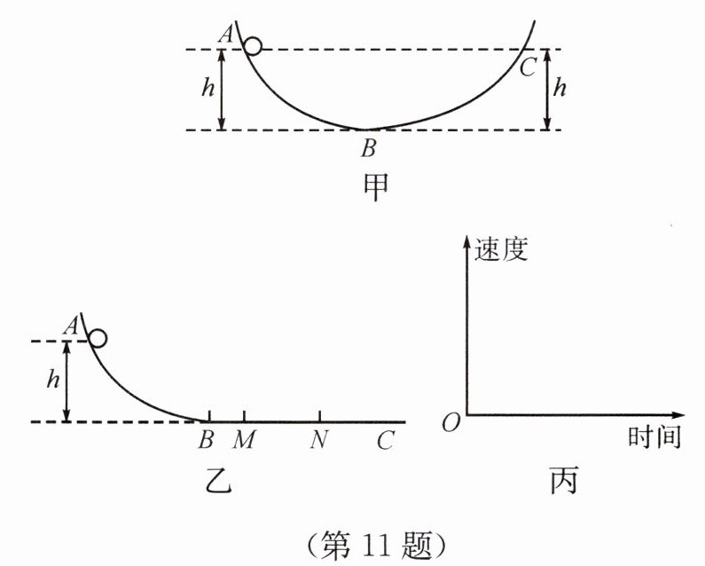 (2)将轨道BC段改为水平,如图乙所示,小球仍从A点由静止释放,小球经过M点时的机械能______(填“大于”“小于”或“等于”)其在A点时的机械能。以小球经过M点时为计时起点,在如图丙所示的坐标中大致画出小球在MN段运动的速度—时间图像。