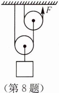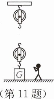 11. 如图所示,工人师傅用一个定滑轮和动滑轮组成一个滑轮组,把重为400N的箱子匀速向上提升5m,动滑轮的质量为8kg(不计绳重和摩擦,$g取10N/kg$)。
