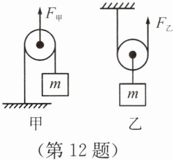 12. 【宁波】如图所示,用同一个动滑轮先后提升同一物体,使物体以相同的速度匀速上升相同的高度,所用的力分别是$F_{甲}和F_{乙}$,拉力做功的功率分别是$P_{甲}和P_{乙}$。若不计摩擦、动滑轮重和绳重,则$F_{甲}与F_{乙}$、$P_{甲}与P_{乙}$之间的大小关系是 ( )