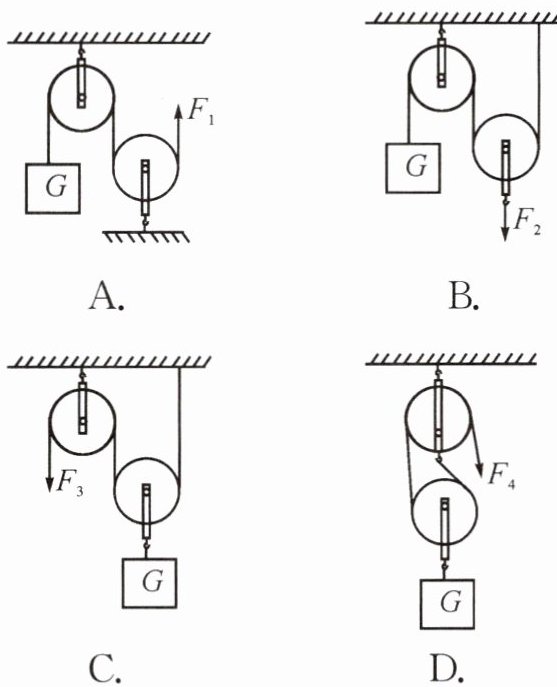 9. 用如图所示的装置来提升重物G。若摩擦力和动滑轮重都不计,则最费力的是( )