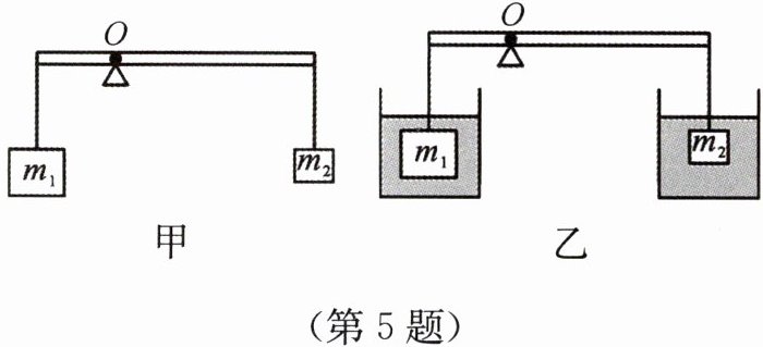 5.【杭州】如图甲所示,有一轻质杆,左、右各挂由同种金属制成、质量分别为$m_{1}和m_{2}$($m_{1}>m_{2}$)的实心物块后恰好水平平衡。