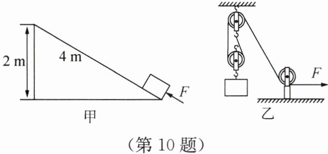 方案一:如图甲所示,他用平行于斜面的推力$F= 240N$,将物体从斜面底端匀速推到顶端,已知斜面高2m、长4m。