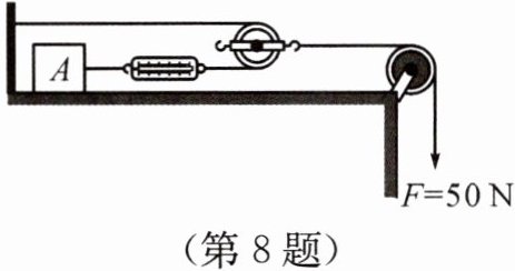 8.如图所示,重100N 的物体 A 在拉力 F 的作用下以1m/s 的速度在水平面上匀速直线运动了2s,该装置的机械效率为80%。上述过程中( )