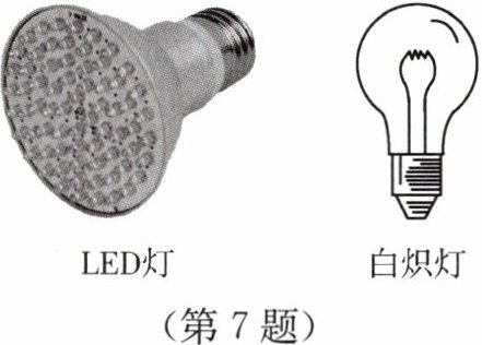 7.【衢州】绿色生态理念要求人们注重环保节能。如图所示为额定功率为5W的LED灯与60W的白炽灯,LED灯直接把电能转化为光能,白炽灯由灯丝通电加热发光,正常工作时,它们亮度相同。