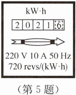 5.【天津】某电能表的表盘如图所示,用电时电能表的表盘每转过720转,接在该电能表上的用电器消耗的电能是 ( )