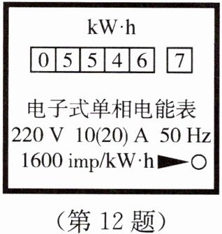 12.如图所示为某家用电能表的表盘,表盘上标有“1600 imp/kW·h”,表示每消耗1 kW·h电能,指示灯闪烁1600次。该表盘上显示已用电______kW·h。若将某用电器单独接在该电能表上正常工作30 min,电能表指示灯闪烁了320次,则该用电器在上述时间内消耗的电能为______kW·h,有______J的电能转化为其他形式的能。