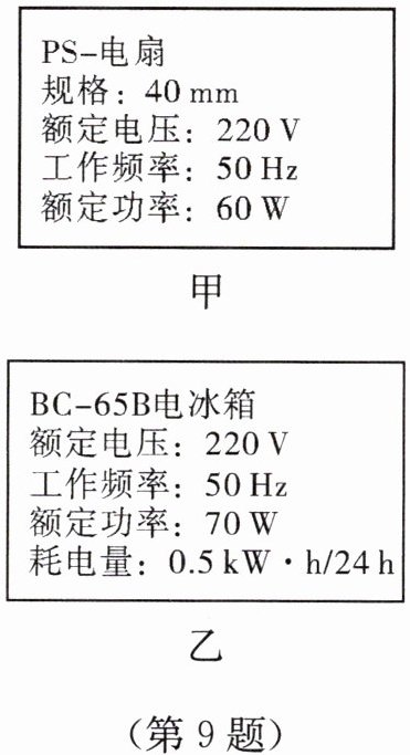 9.如图所示为甲、乙两种用电器的铭牌,则在24 h内正常使用电扇、电冰箱消耗的电能情况是 ( )