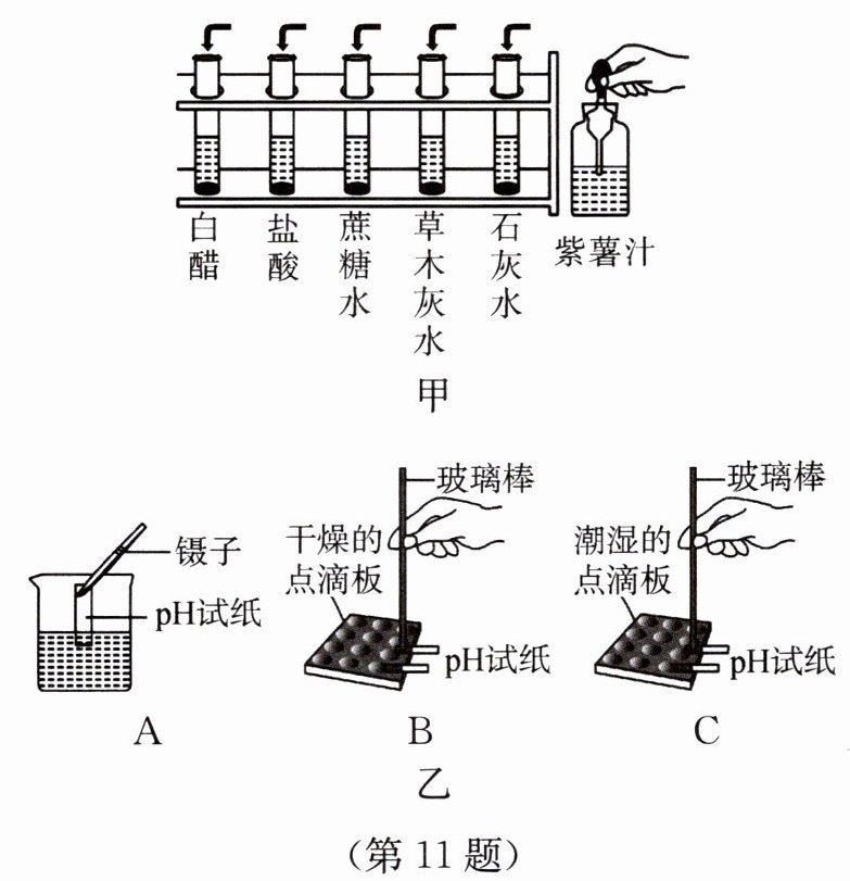 (2)用pH试纸测定图甲中部分溶液的酸碱性强弱:草木灰水pH>7,属于______(填“酸性”“中性”或“碱性”)溶液,白醋pH______(填“>”“<”或“=”)7。
