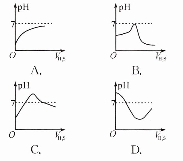 12. 在相同条件下$,H_2S($氢硫酸)的酸性比$H_2SO_3($亚硫酸)的酸性强$,H_2S($氢硫酸)是$H_2S($硫化氢)气体的水溶液$,H_2SO_3($亚硫酸)是$SO_2$与水反应后形成的溶液。在室温时,向饱和的$H_2SO_3$溶液中通入$H_2S$气体,发生的反应如下:$2H_2S+H_2SO_3= 3S↓+3H_2O。$下列几幅图中,与向$H_2SO_3$溶液中通入$H_2S$的体积和溶液pH的关系相符的是 ( )