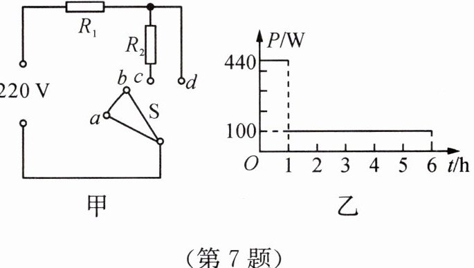 7.【台州】某电热砂锅的简化电路如图甲所示。$R_{1}$、$R_{2}$为发热电阻,S为旋转型开关,a、b、c、d为触点,通过旋转开关S可实现“关”“低挡”“高挡”之间的转换,工作时先用高挡加热锅内汤料到沸腾,再用低挡持续加热食物,使食物“汤浓味鲜”。
