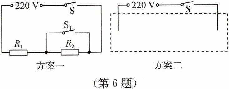 【方案设计】为实现上述功能,同学们利用两个不同阻值的电阻($R_{1}<R_{2}$)进行设计,其中方案一如图所示。利用方案一中的器材,请将方案二的电路补充完整。