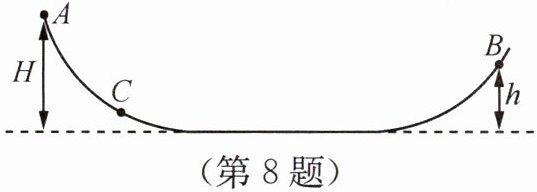 8. 【杭州】如图所示为两个光滑的圆弧槽和一段粗糙的水平面相连接的装置。将质量为m的物体从左侧圆弧槽A点由静止释放,最高到达右侧圆弧槽B点处,然后再次滑下,最高到达左侧圆弧槽C点处,其中A、B两点距离水平面的高度分别为H、h。(忽略空气阻力)