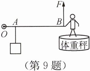 9. 如图所示,某小组探究“利用体重秤和一根长1m的轻质木棒,测量边长为0.3m的正方体合金块的密度”,先用体重秤测出一位同学的质量为60kg,再将木棒支在O点,合金块挂在A点,OA= 20cm,让该同学站在体重秤上,用手将木棒抬到图示位置,此时体重秤的读数为76.2kg。(g取10N/kg)