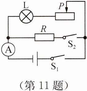 11. 【乐山】如图所示的电路中,灯泡L标有“6V 3W”字样(不计温度对灯丝电阻的影响)。当开关$S_{1}$、$S_{2}$均闭合,滑动变阻器的滑片P在最左端时,电流表的示数为1.5A,并且灯泡L正常发光;当开关$S_{1}$闭合、$S_{2}$断开,滑动变阻器的滑片P在中点时,电流表的示数为0.25A。求: