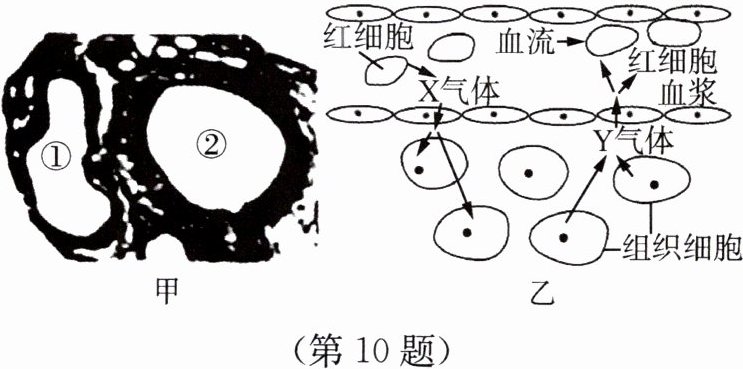 10. 图甲是人体内的两种血管的横切面,图乙是人体内血液与组织细胞之间的物质交换示意图,请据图回答下列问题: